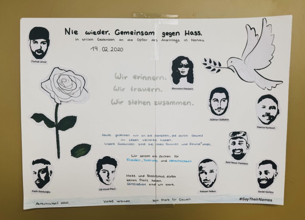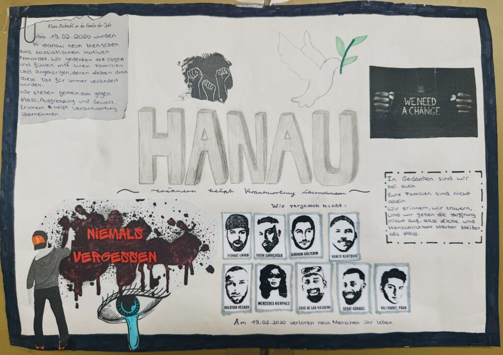 Anhand des Themas Hanau wurde die Problematik konkret und anschaulich vertieft. Die Klasse beschäftigte sich mit den Hintergründen der Ereignisse und reflektierte die gesellschaftlichen Folgen von Ausgrenzung und rassistischem Denken. Dabei entstanden persönliche Gedanken, Beiträge und Gestaltungsideen, die die klare Haltung der Schülerinnen und Schüler gegen Hass und Diskriminierung deutlich machen.