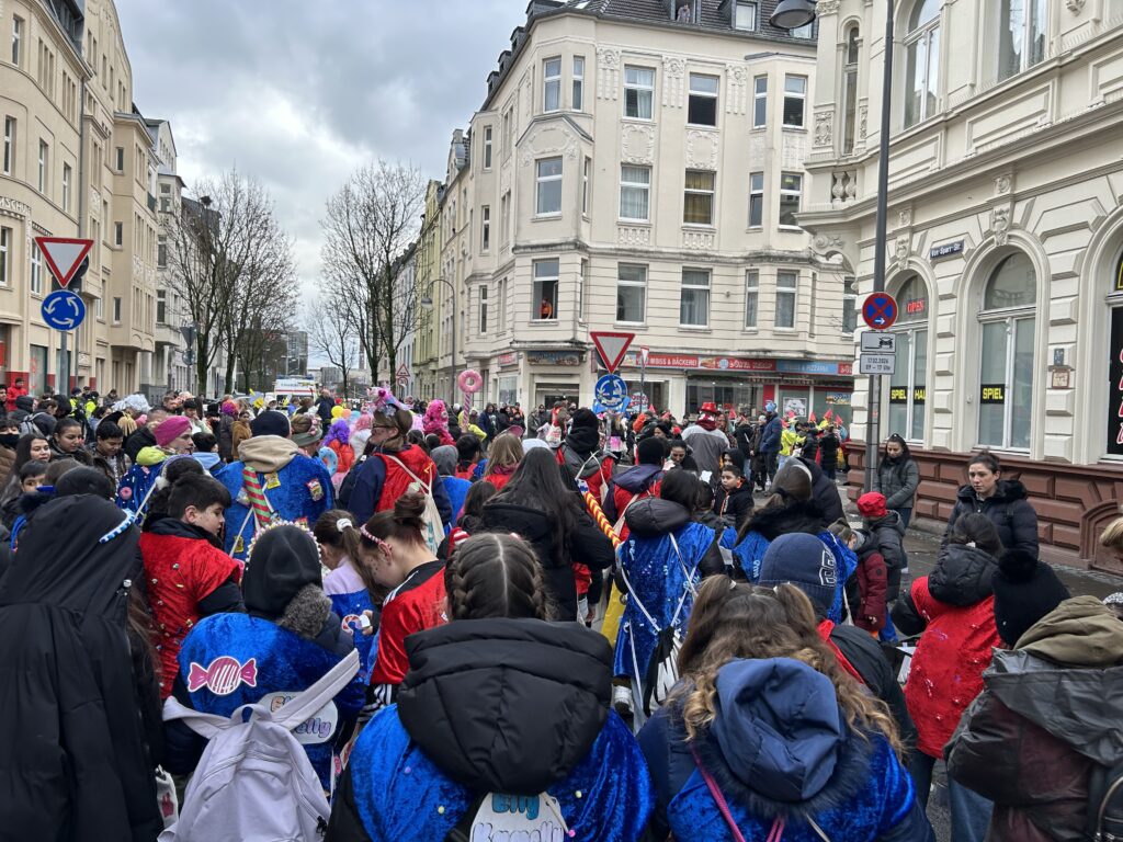 Das Wetter zeigte sich deutlich freundlicher als zunächst befürchtet: Trotz vorsorglich eingepackter Regen-Capes blieb es fast durchgehend trocken. Der traditionsreiche Veedelszoch führte über mehrere Kilometer durch die Straßen des Veedels und wurde von zahlreichen Jecken am Straßenrand begeistert begleitet. Die Schülerinnen und Schüler waren während des gesamten Fußmarsches mit großer Begeisterung dabei: Sie warfen Kamelle in die Menge, riefen laut „Alaaf!“ und „Kamelle!“, tanzten und strahlten über das ganze Gesicht. Besonders beeindruckend war, wie souverän und fröhlich die Kinder den langen Weg meisterten – die gute Laune hielt (zumindest bei den meisten) bis zum Schluss. Zwar dauerte der Zug am Ende fast eine halbe Stunde länger als geplant, doch die Stimmung blieb jeck. Gegen 17 Uhr erreichte die Gruppe wieder die Schule.