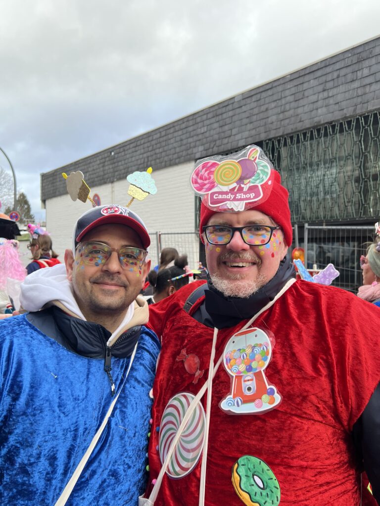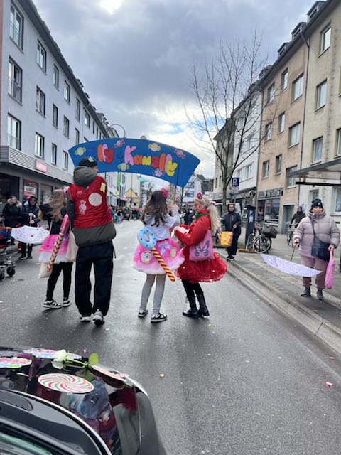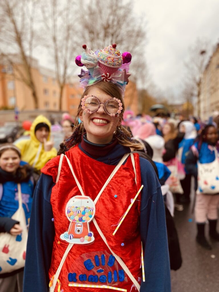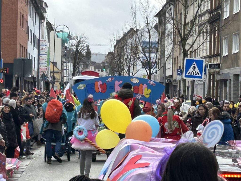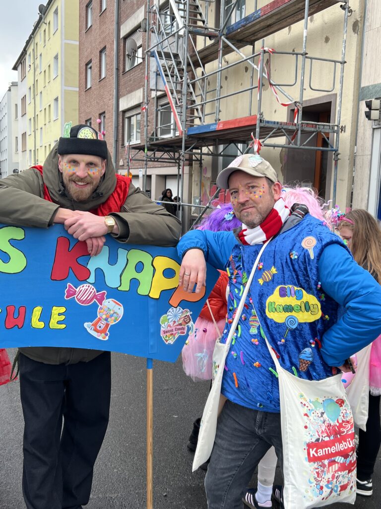 Unter dem Motto „Elly Kamelly“ zog die bunte Gruppe durch die Straßen von Köln-Mülheim. Monatelange Vorbereitungen zahlten sich mehr als aus. Die selbst gestalteten Kostüme stellten bunte Bon-Bons, verlockende Süßigkeiten und andere „Kamelle“ dar – kreativ, farbenfroh und mit viel Liebe zum Detail gebastelt. Sie waren der sichtbare Ausdruck der kunterbunten Schule und sorgten bereits beim Aufstellen für neugierige Blicke.