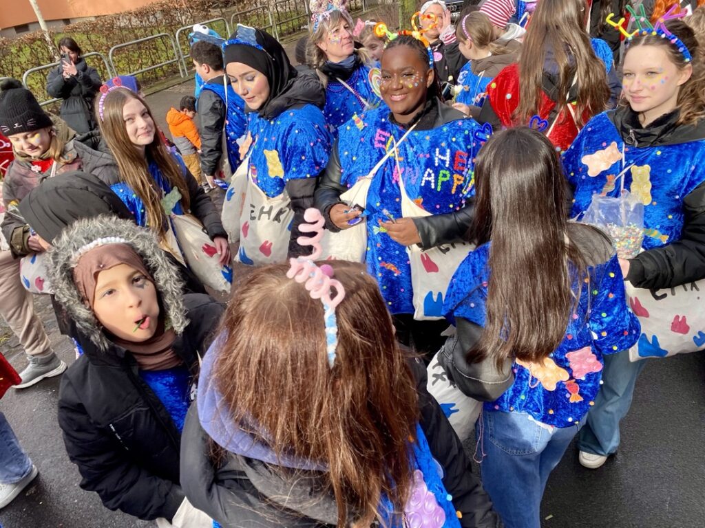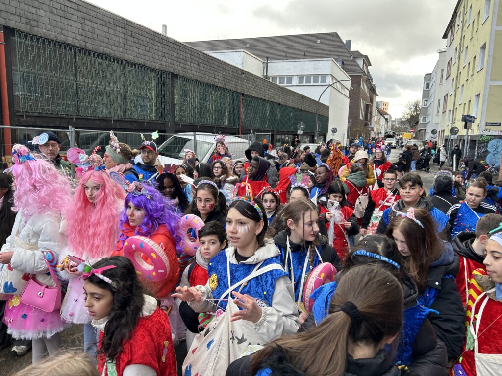 Um 14.15 Uhr versammelte sich die große Gruppe am Startpunkt des Zuges. Insgesamt nahmen mehr als 100 Kinder der Schule teil – darunter drei komplette 5. Klassen sowie viele weitere Schülerinnen und Schüler aus allen Jahrgangsstufen. Angeführt von Schulleiterin Dr. Drewniok und begleitet von rund 20 Lehrkräften, die tatkräftig unterstützten, die Kammelle-Beutel nachfüllten und selbstverständlich ebenfalls kostümiert den gesamten Zoch mitzogen.